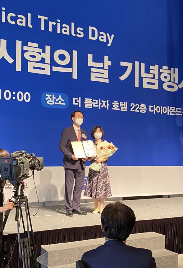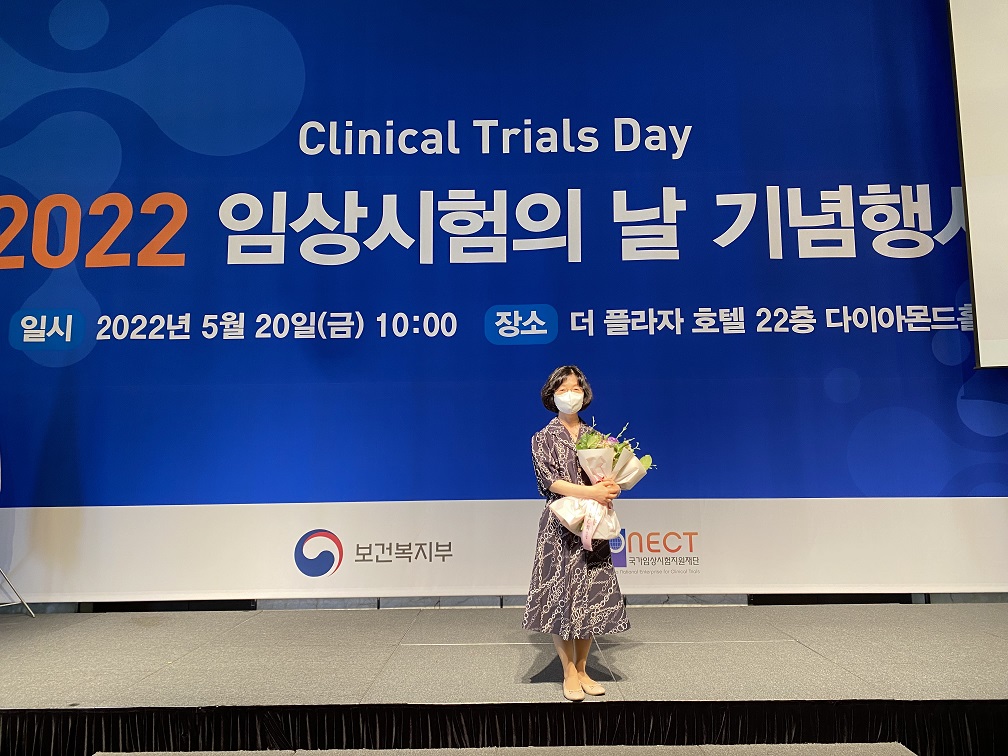 서울대병원 하인숙CRC선생님은 국가임상시험지원재단 주관으로 ‘2022년 임상시험의 날'을 기념한 임상시험 유공자 정부 포상식에 ‘임상시험 진흥부문 임상시험 유공자'로 보건복지부장관 표창을 수상했다.