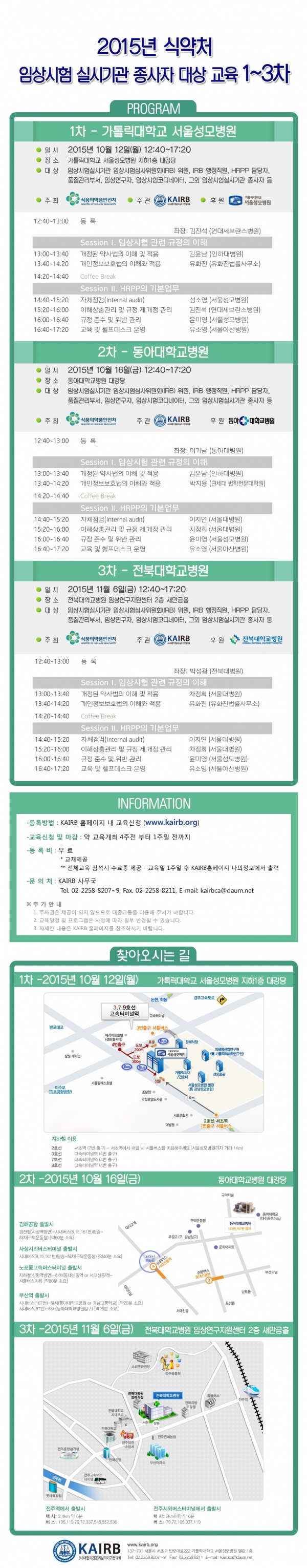 - 등록비: 무료(교재제공, 전체교육 참석시 수료증 제공: 교육일 1주일후 KAIRB홈페이지 나의 정보에서 출력)